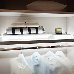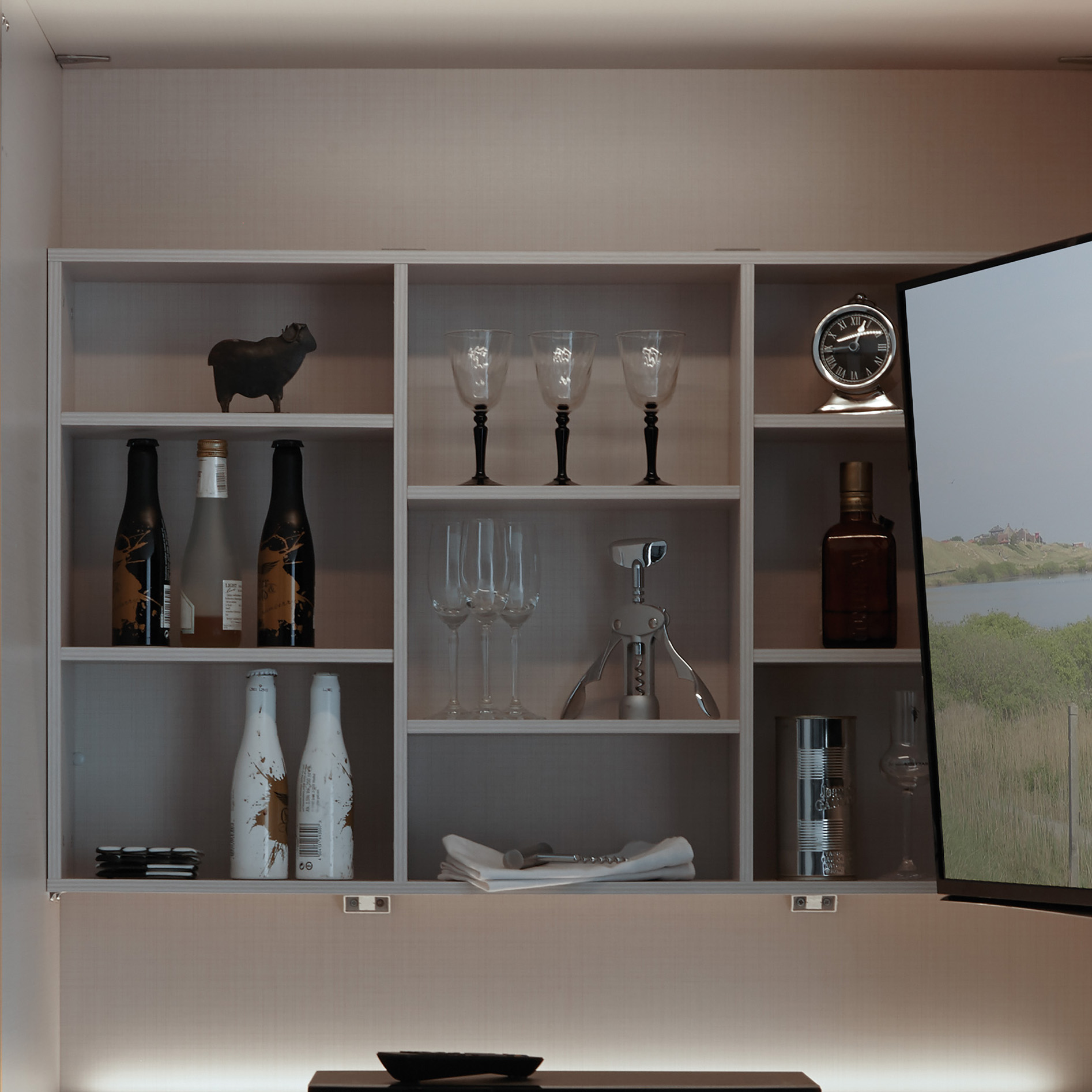 Komfortable Öffnungs- und Schließdämpfer für Außentüren und Mitteltüre, ein Glasfachboden mit oder ohne Glaskantenbeleuchtung, eine TV-Halterung und ein TV-Regal, Schubkastenbeleuchtung und Schmucktableau, ausziehbare Wäschekörbe: intelligentes und sinnvolles Zubehör, speziell entwickelt für das innovative PICTO Schrankprogramm.