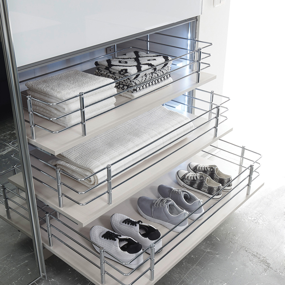 Schwebetürenschränke mit Fronten aus hochwertigen Gläsern bieten direkt in die Front integrierte Schubkasten-Einheiten, intelligente Stauraumlösungen und attraktives Zubehör.