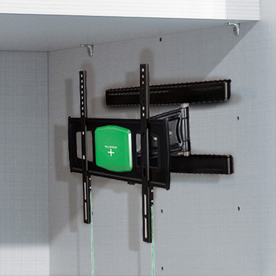 Innovation pur: Ihr TV-Flachbildschirm wird als „Eyecatcher“ in die Schrankfront integriert. Das technische Konzept ermöglicht gleichzeitig die Nutzung Ihres Fernsehgerätes und den ungehinderten Zugang zum Schrankinnenraum.