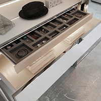 Konfigurieren Sie die Schranktüren mit unterschiedlichen Gläsern. Wählen Sie für die Gestaltung der Schubkästen aus 5 Gläsern, 5 Dekoren und 4 Mattgläsern.